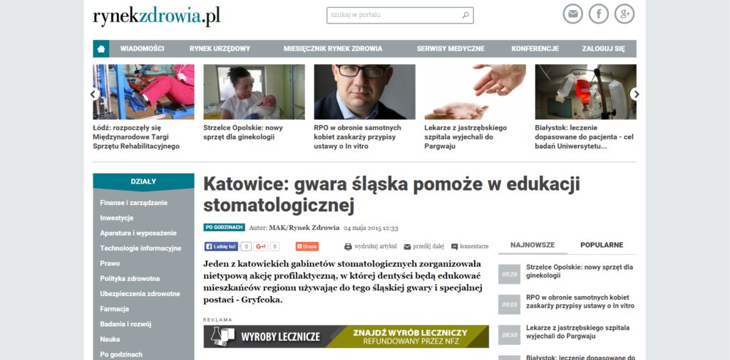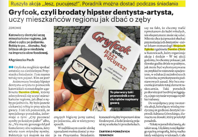 Jeden z katowickich gabinetów stomatologicznych zorganizowała nietypową akcję profilaktyczną, w której dentyści będą edukować mieszkańców regionu używając do tego śląskiej gwary i specjalnej postaci – Gryfcoka. Więcej